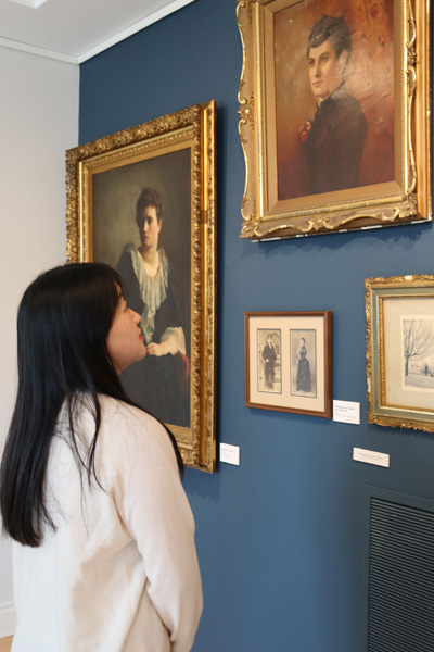 A visitor enjoying historical artwork from the exhibition Great Tait: The True Story of Orillia’s First Millionaire.