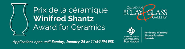 The winner of the Winifred Shantz Award for Ceramics will receive $10,000. One runner-up will receive a prize of $5,000. Up to 3 finalists will also be selected who will each receive a prize of $1,000. The winner, runner-up, and finalists will have their work featured in a group exhibition at the Canadian Clay & Glass Gallery in 2026.