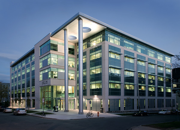 1. Exterior image at night of the Kenneth C. Rowe Management Building.