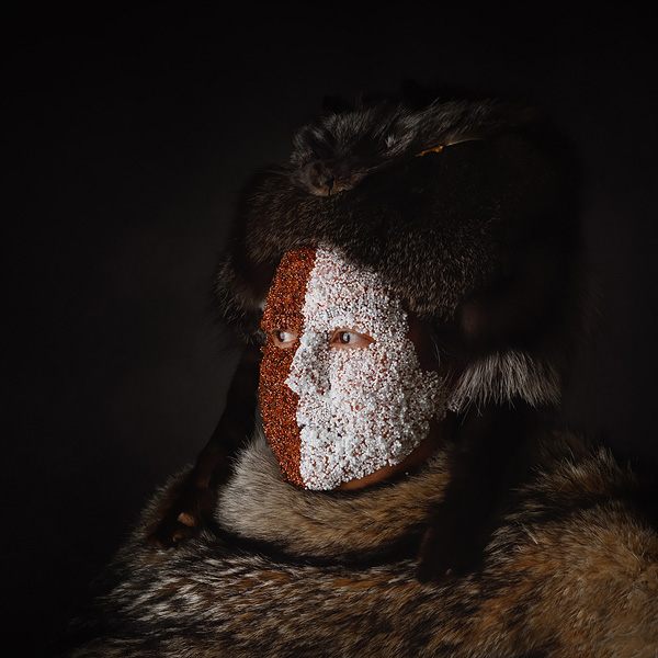Marcy Friesen, Half Breed, 2021, seed beads and adhesive, silver fox hat, coyote throw. Susan Stewart Photography