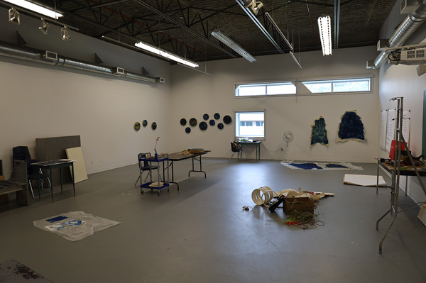 Michelle Sound’s studio during the Indigenous Art Intensive, May 2023. Sound created a series of cyanotype prints rawhide drums using flora and landscape images.