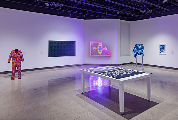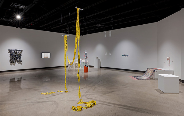 Installation shot of Fibreworks 2022, Queen’s Square Gallery at Cambridge Art Galleries, Cambridge Public Library. Photo: Toni Hafkenscheid.