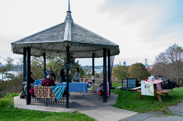 1) COLLECT/ive grief COLLECT/ive joy, Corrie Peters, October 15, 2023. Photo by Mayur Kakreli. Description: An outdoor gazebo is set up with colourful blankets, and people can be seen sitting and standing inside. To the right a picnic table is set up with various items. The Halifax cityscape and the Harbour can be seen in the background.