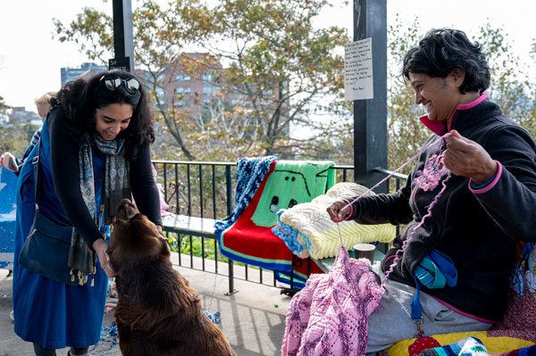 3) COLLECT/ive grief COLLECT/ive joy, Corrie Peters, October 15, 2023. Photo by Mayur Kakreli. Description: A person can be seen sitting and unraveling a pink crochet blanket while a person on the left bends down to pet a large brown Chocolate Lab.