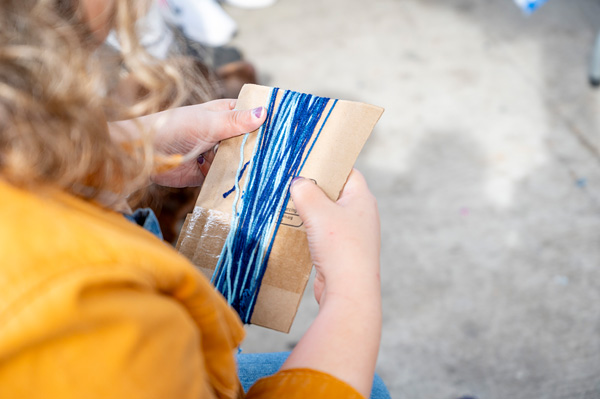 4) COLLECT/ive grief COLLECT/ive joy, Corrie Peters, October 15, 2023. Photo by Mayur Kakreli. Description: View from over someone’s shoulder, wearing a golden yellow coat and holding a small piece of cardboard with blue yarn wrapped around it.