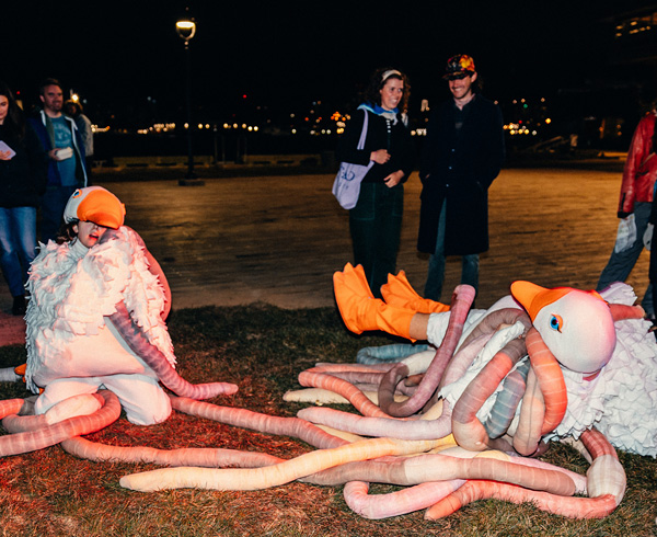 1) WHAT WILL THE WORMS THINK OF ME? by Bethany MacKenzie (featuring DARTMOUTH GEESE ON VACATION by Eastern Front Theatre). Photo by James MacLean. For Nocturne: Ground, October 18, 2025. Description: An outdoor, night-time photo showing two people dressed in white goose costumes playing with a pile of several large, soft worm sculptures. They are placed on a patch of green sod which has been situated on a wooden boardwalk and five people are standing behind them watching with amusement.