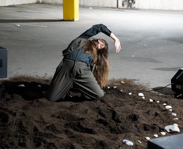 2) Untitled (Clock – Piece) by Susannah Haight. Durational performance. For Nocturne: Ground, October 18, 2025. Photo by Ginger Yu. Description: A dancer is posed on their knees with their left arm above their head. They are kneeling within a large circular pile of soil encircled in stones. There are large black speakers around the circle and they appear to be inside a concrete parking garage.
