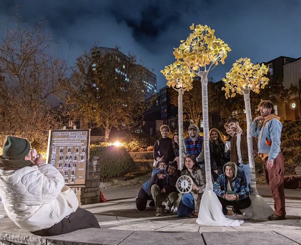 3) Different Shoots, Same Roots by Jeighk Koyote. Interactive installation. For Nocturne: Ground, October 18, 2025. Photo by Tarek El Wazzi. Description: An outdoor night-time photo showing a group of 12 people posing for a polaroid photo in front of a stand of three fake aspen trees with bright yellow leaves. Seven of them are standing, and five are crouched in front of them, all smiling at the camera. The person taking the photo wears a white puffer coat and green toque, and they are sitting on a stone bench leaning back. To their left there is a cork board showing various polaroids of other people in front of the trees.