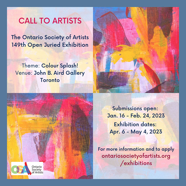 The Ontario Society of Artists (OSA) invites Canadian artists to apply to our 149th Annual Open Juried Art Exhibition, with the theme Colour Splash. This exhibition will welcome spring with splashes of reviving and re-invigorating colour after the dormancy of winter. We look forward to seeing how you use colour to inform and shape your work.
