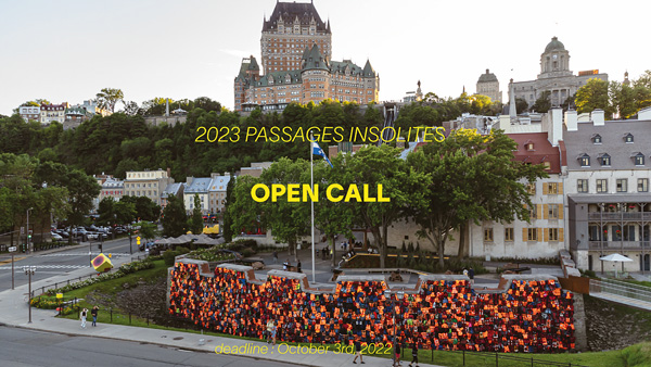 As the ninth edition of PASSAGES INSOLITES is still in full swing, the EXMURO arts publics team is preparing the next iteration of its flagship event in ephemeral public arts. The tenth edition of PASSAGES INSOLITES will take place in Quebec City over the Summer of 2023. The organization is launching a call for proposals inviting professional artists from Quebec, Canada, and the World to submit work of temporary public art to be included in the 2023 programming of the circuit, whether they are new projects or existing works.