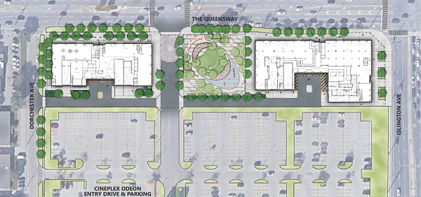 The project site is surrounded by two connected 9-storey, residential condominiums to the north, 3-storey residential townhouses to the east, the Queensway Cineplex Theatre to the south, and low-rise commercial buildings to the west.