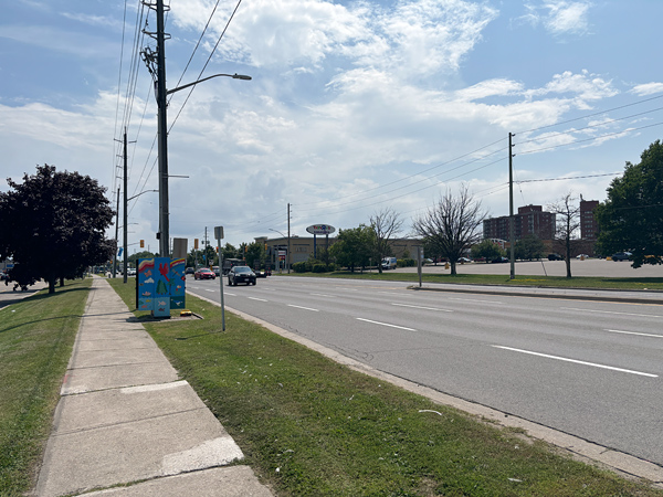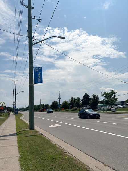 The Corporation of the Town of Whitby is located on the Lands of the Great Mississauga Nations, who are signatories to the Williams Treaties. Thickson Road is located in the Town of Whitby and is a busy north-south roadway that is primarily vehicular oriented, containing commercial plazas with large parking areas on either side with a pedestrian sidewalk flanking the edge of the road and a large right-of-way to accommodate 4-5 lanes of traffic. Traffic volume is approximately 22,000 vehicles per day with a speed limit of 60 km/hr. Hydro lines flank either side of the road, and the area lacks community character and cohesiveness. This area contains many commercial uses including the Whitby Mall, restaurants and fast-food chains, grocery stores, retail shops and service-oriented businesses.