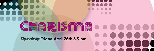 1. An image with a pink, yellow, and blue circle, the word CHARISMA across the centre, an exhibition opening date of Friday, April 26th, 6-9pm. Smaller black circles surround the text giving it a retro 60s pop art flair.