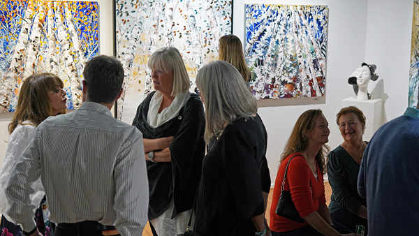 2. An image of several people talking during an art exhibition with artwork on the white walls behind them.
