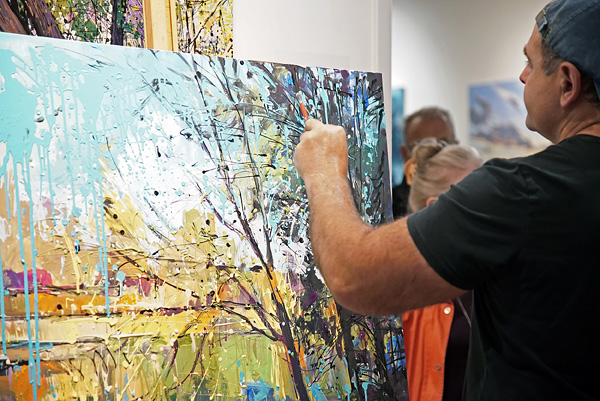 3. An image of artist Eduard Gurevich painting a landscape with acrylic paints, a paintbrush in his hand and people surrounding him in the background.