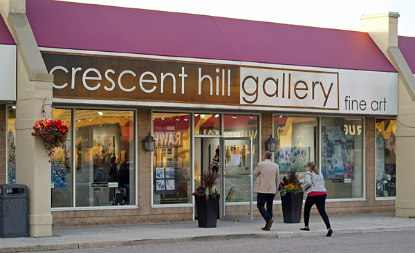 4. An image of the front of a gallery that has a sign in black and white, outlined in gold, that says Crescent Hill Gallery. Two people, a man and a woman, walk up to the front door. Artwork hangs in the windows.