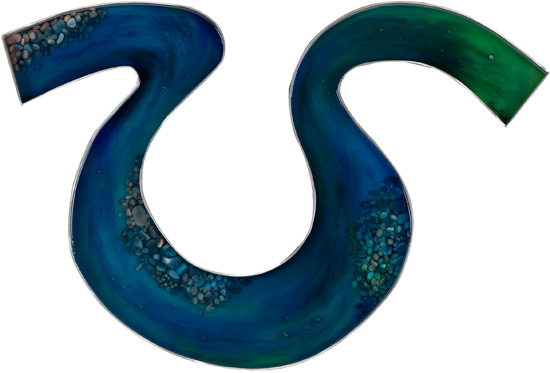 Water Features is a collection of works inspired by encounters with waterways the world over. Captivated by the rivers that carve their way through Alberta, Brooks began experimenting with different resins for their ability to retain fluid features in a solid state. Sculptural in the way that handmade river elements are embedded, the works retain a distinct painterly quality with the tinted layers of resin designed to add movement and depth.