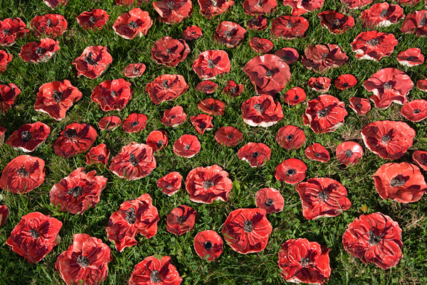 1. Hundreds of red poppy flowers made of clay being displayed on grassy ground