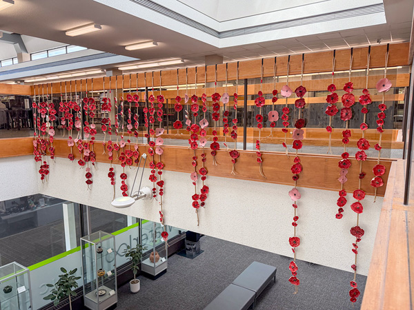 Waterloo Public Library is hosting Echoes in the Bloom, an installation by artist Christopher He, at the Main Library this fall. The installation brings together more than 300 ceramic and paper poppies created by community members from across the Region of Waterloo.