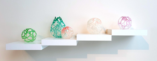 Through the forces of erosion that slowly alter our landscapes glass artist Hannan Fayad sees both the power of the natural environment and the role that humans play in our changing climate. Wind, sand, and water wear away and break the earth with impressive force that reveals striking patterns over time. Using a sandblaster as a carving tool, Fayad mimics these eroding forces on her own glass forms. In a range of colours and shapes, the once strong glass pieces become delicate frames of their former selves. The structure of the form remains, but the etched holes evoke the erosion patterns that inspire Fayad. They invite close inspection, and a desire to explore the strands of glass that hold together their airy forms. At the same time, however, the delicacy of these forms elicits caution—both of the human impact that speeds climate change and of the fragility of the natural environment’s balance that can be shattered so quickly.