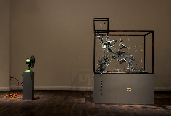 Atticus Gordon, Assembly line for the production of fruit, 2018, Baltic birch, thread, fishing line, spray paint, oil paint, various plastics, 3D prints, oil paper, oranges, fan, model figurines, and porcelain.