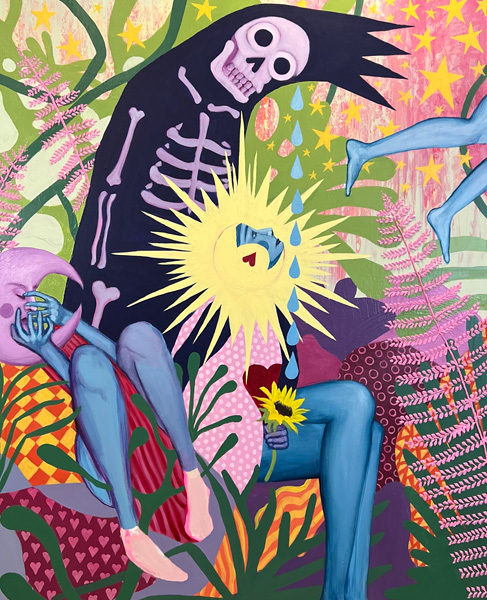 Where his canvas becomes a personal journalistic excavation, such paintings inevitably come to reflect and interpret a unified humanity. At its core, Upon a Star, honours the range of human experiences as indebted to a life of continuous growth and transformation. The artist reminds us that while tomorrow is never promised, hope and beauty will always surround us in some way. Woven together through repeated iconography and symbolism, he creates a visual language that speaks to the surreal nature of our lives and eternally liminal presence amongst the stars we reside.