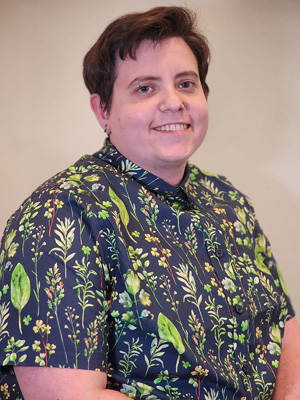 2) Shay, a white, non-binary, trans-masc human looks directly at the camera grinning. They have short brown hair that is cut close on the sides and longer on the top. They have facial piercings in their eyebrow and nose. Shay is wearing a short-sleeve button-down shirt that is dark blue and has a green and maroon plant pattern all over it.