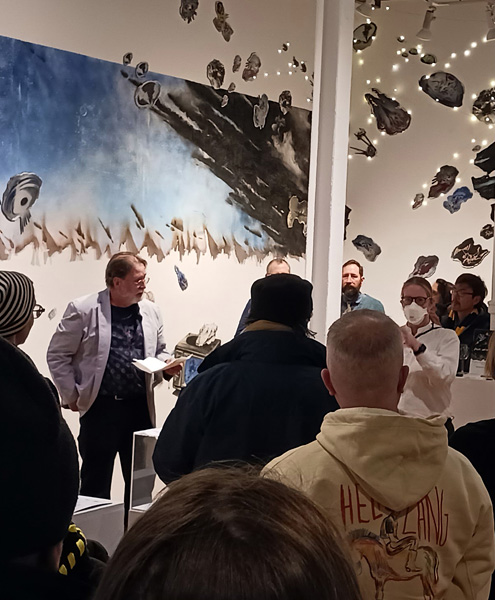 “What’s going on here? Okay. I admit it. I don’t really know what this show is all about. And I guess in the Age of Uncertainty that is appropriate. These images definitely pose more questions than providing answers. Come with me on a journey that neurotically pokes at the stresses of climate change. Feel the relentless pressure of time ticking away.