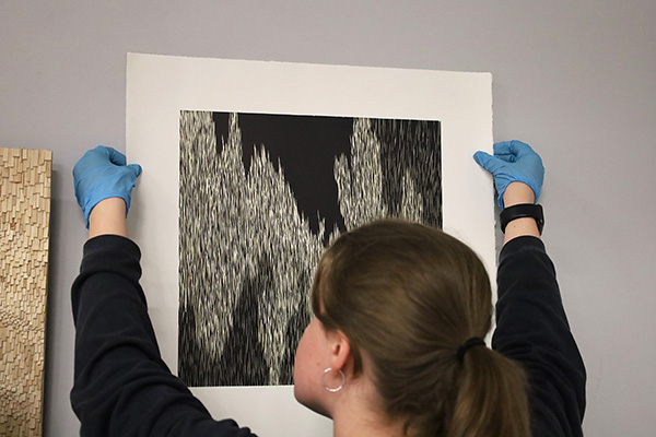 Museum and Gallery Studies student installing Dual Perspectives: Art in Conversation in The Campus Gallery, December 2024. Photo by Amy Bagshaw.