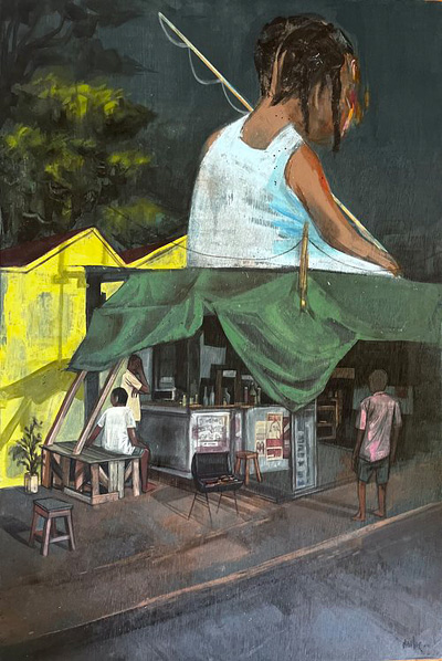 In this exhibition, memory interacts with truth and fiction, fact and emotion. The works address the desires for belonging that inform nostalgia: for places, people, communities, ways of being. In one vignette, a girl-child perches Gulliver-like atop a shack while other figures contract to Lilliputian scale. A man looms large and friendly over a building. A family sits on a beach, the mother protectively holding on to a child on her lap. Angular and architectural buildings overlay a sense of perspective with the natural environment present in essence.