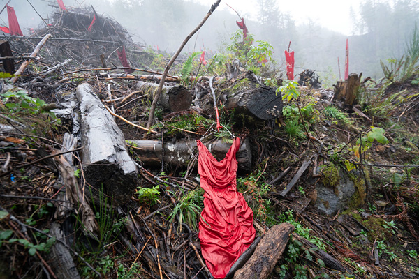 Larry Towell, Red dress memorial for Murdered and Missing Indigenous Women on clear cutting. Granite Ridge Road, Fairy Creek, British Columbia, 2021, digital photograph
