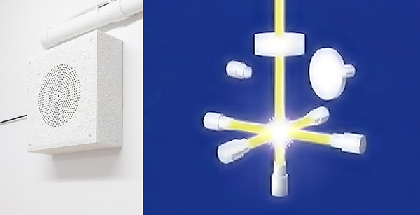 Images (left to right): Emily DiCarlo, Talking Clock Choir, 2022. Four-channel sound installation, PA speakers, modulated talking clock public service announcements every half hour. Photo: Alison Postma. Emily DiCarlo, Caesium Half-Life, video still, 2024. LED screen, video, sound, 37.75 x 31.25 inches.