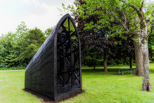 Oluseye, Black Ark, 2022, polished aluminum, burnt wood, soil, 365.8 x 304.8 x 128.9 cm. © Oluseye, 2024