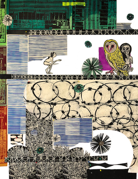 In this site-specific immersive woodcut installation, Libby Hague, one of Canada’s most recognized print-based installation artists, creates an imaginary environment that examines the complexity of female relationships in an anxious, precarious, yet inter-connected world. Her work is framed around a narrative of escape and rescue. The women depicted in this work are placed in a state of migration navigating the dangers associated with seeking a better life. Myths of self-reliance are shattered, despite obvious determination. It is through friendship, collaboration and the forming of social bonds that we survive.