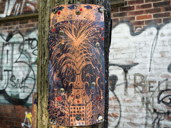 Over the past twenty years, Dobey has developed a more formal public practice of intaglio prints, copper sculptures, and more recently large etched works in copper, enhanced with porcelain paint, tar, and other materials. The new works address many of the same concerns as the early street art, but applied to a much larger scale, and use techniques derived from printmaking and sculptural traditions.