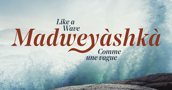 1) The words “Like a Wave,” “Madweyàshkà,” and “Comme une vague” on a photograph of crashing waves.