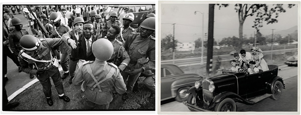 Left: Robert Lebeck, Young man steals the sword of King Baudouin I, during procession with newly appointed President Kasavubu, Leopoldville, Republic of the Congo (now Democratic Republic of the Congo), June 30, 1960, gelatin silver print. The Image Centre, Gift of Robert Lebeck, 2012; Right: Ralph Crane, Student Trip, California, 1949, gelatin silver print. The Black Star Collection, The Image Centre
