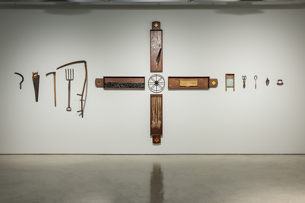 Jessica Rachel Cook, Under the blanket, 2023, repurposed church pews, anthracite coal, durum wheat, beeswax, antique tools, and mixed media. Photo: Frank Piccolo.