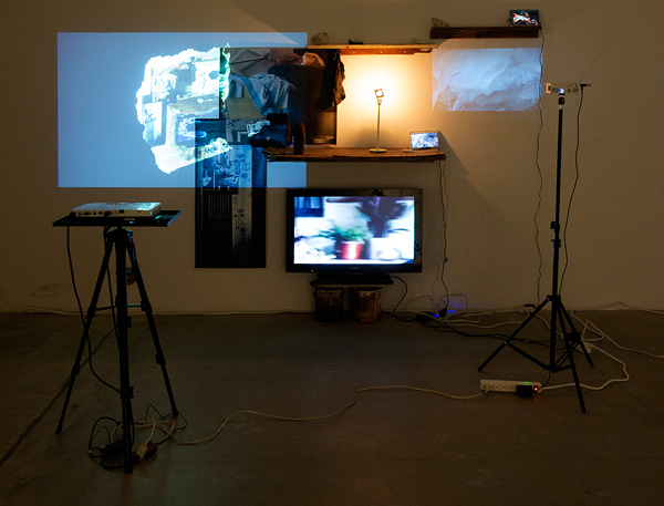 Sasha Opeiko, by constant flow all things are thinned, 2022. Found objects, video, media devices, photo prints. Dimensions variable.