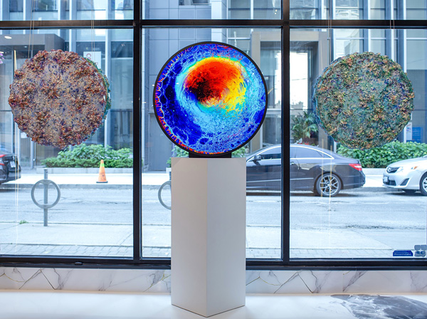 1. A vibrant installation view of three circular mixed-media works, including a luminous, light-emitting centrepiece, displayed against a floor-to-ceiling window.