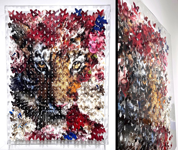 2. An image of a tiger’s face emerging through thousands of cut out paper butterflies.