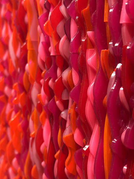 3. A close-up view of layered, wavy strips of pink, red, and orange plexiglass.