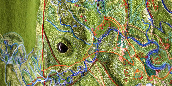 Image details: Michelle Wilson, Warden’s Watch (detail), 2024, felted wool blanket, archival maps, embroidery thread, wool roving, glass eye. Courtesy of the artist.