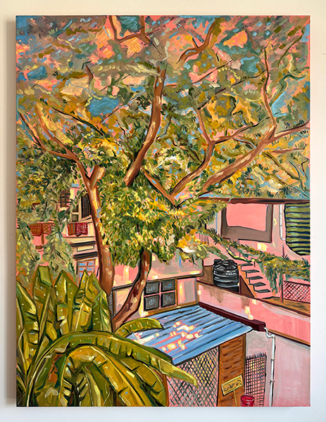 Par Nair, the view from her bedroom window, 2025, oil on canvas. Courtesy of the artist.