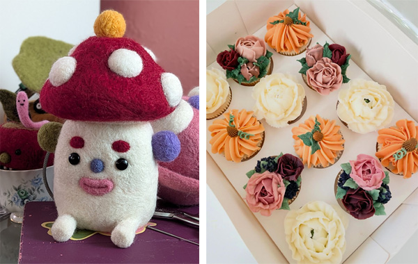 Images (left to right): Holly Gilmour’s needle felted creatures. Beautifully Delicious’ seasonal flower cupcake decorating.
