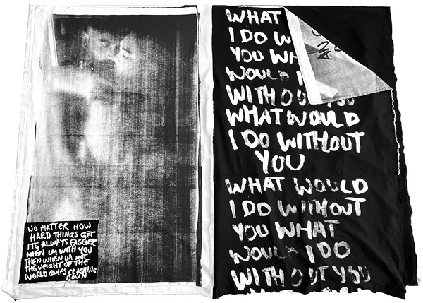 Olivia Mae Sinclair, It Takes Two, screen-printed linen, photo collage, cotton thread, 2024. Image courtesy of Artist.