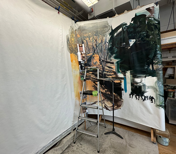 Gillian Iles, the one-eyed man is king (detail), 2024, oil, acrylic and pastel on housewrap, 180″ x 60″