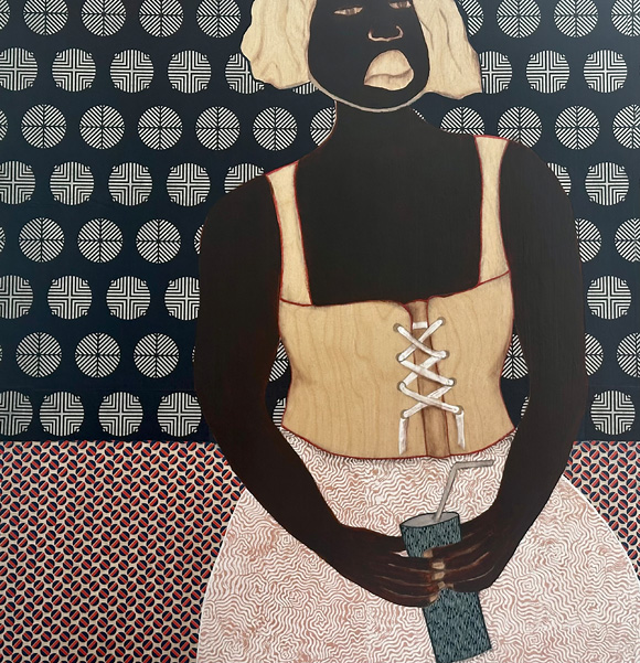 Since 2020, Hazelle Palmer has deepened her exploration of a unique materiality, combining patterned paper, acrylic paint, stencilling and hand-drawing with pencil and charcoal. The results are immediately recognizable as hers alone.