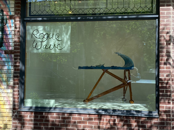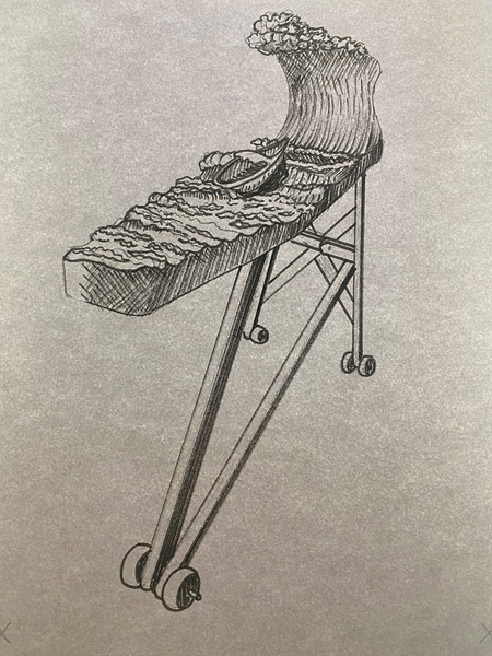 Rogue Wave reveals an empty boat, without a person, only a wave within the boat. The narrative of the water with its formidable oncoming wave emboldens the notion of “journey” into the unknown, where potential danger is met with the boats direction into an unpredictable, “rogue” wave. The significance of an ironing board as a pedestal points to the importance and supportive actions of everyday practices.