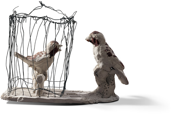 Liu Shiming, Looking at Each Other Through the Cage 隔笼相望, 1990, Bronze.